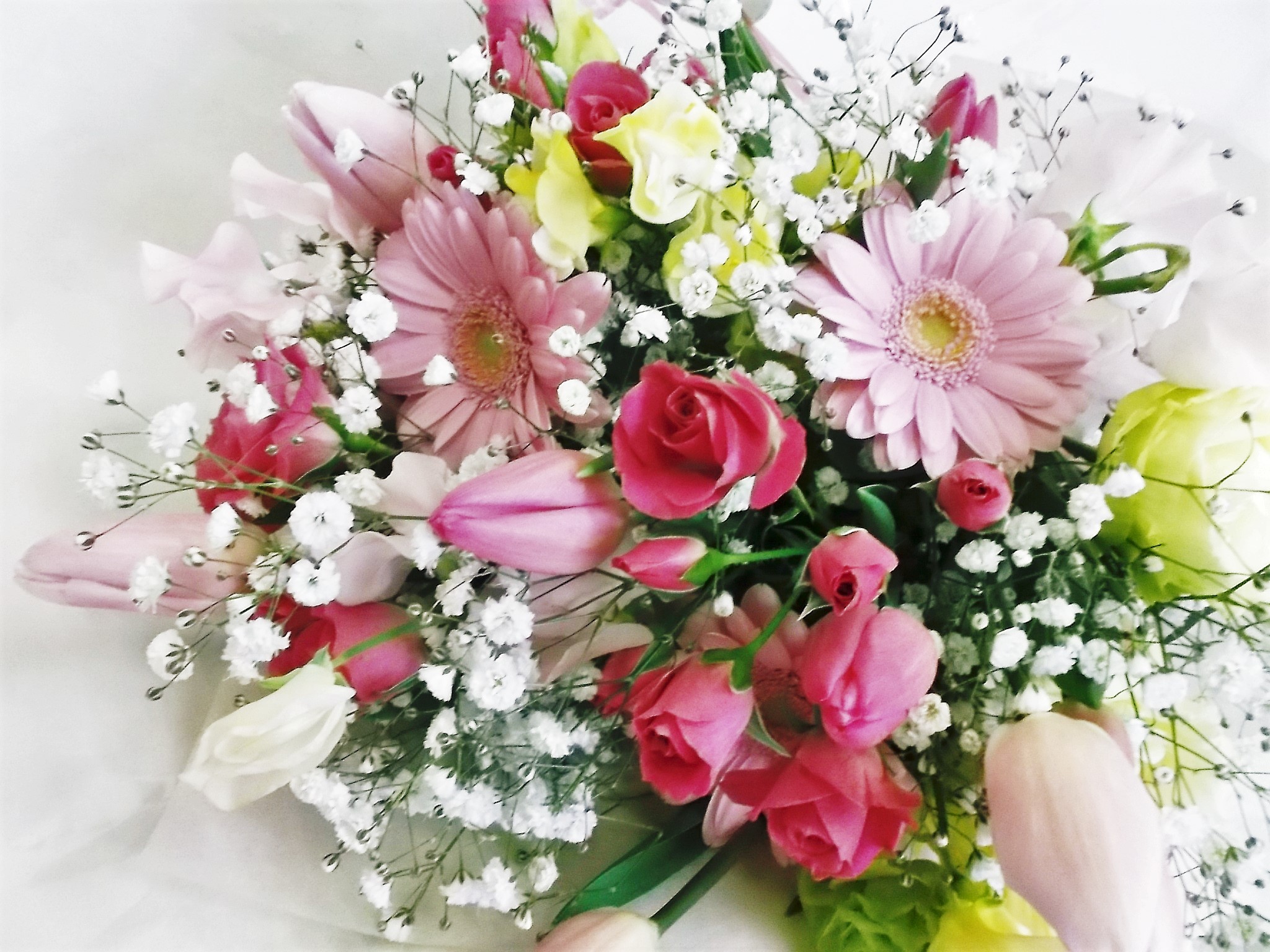 ピンクのチューリップやスイートピーなど春らしい