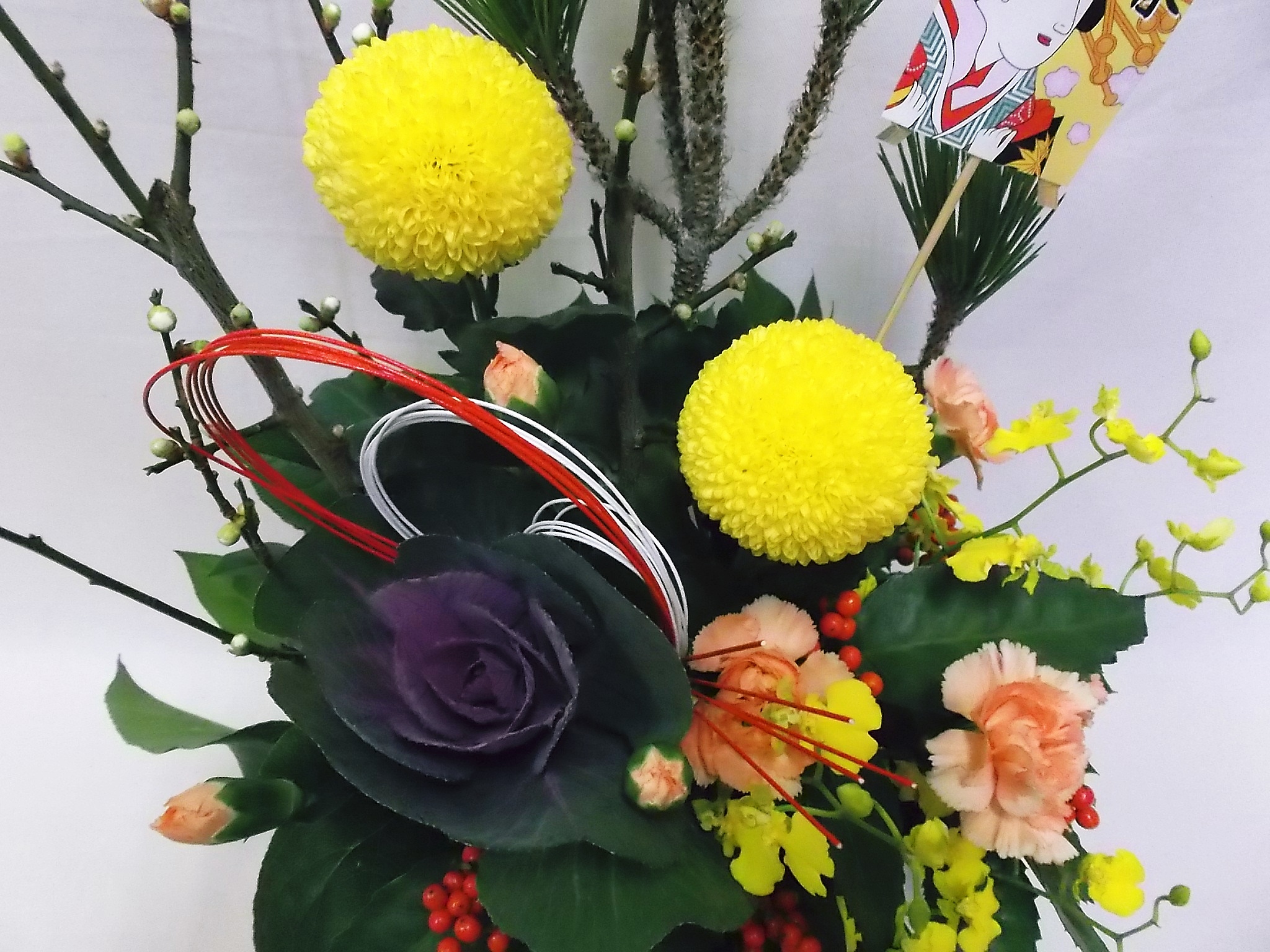 松やピンポン菊、千両が入ったお正月用のアレンジメントです。